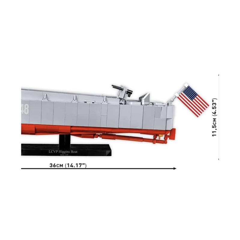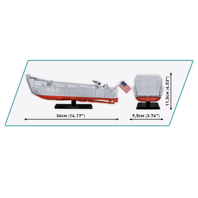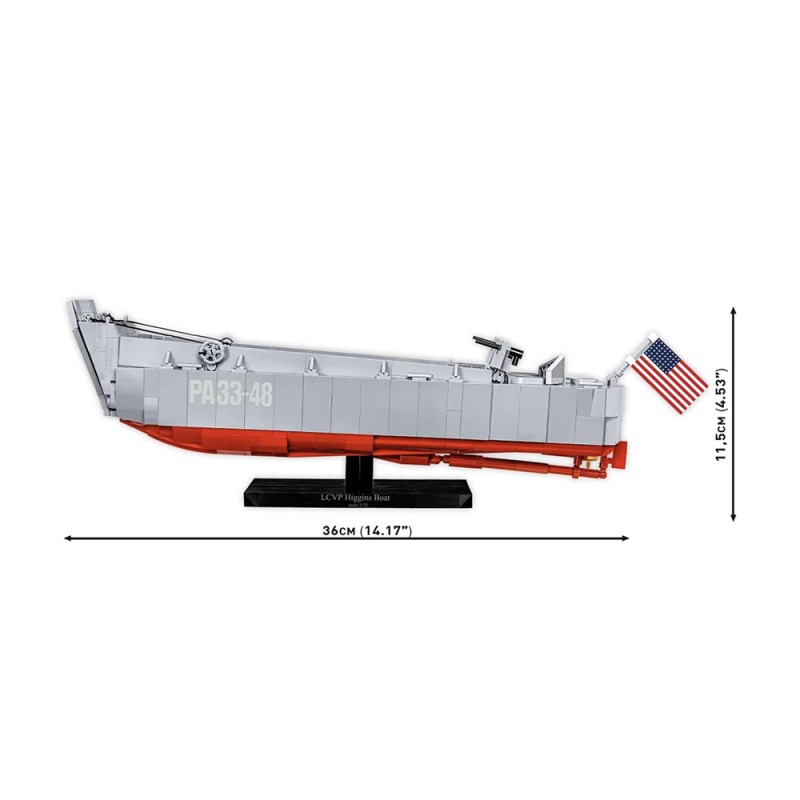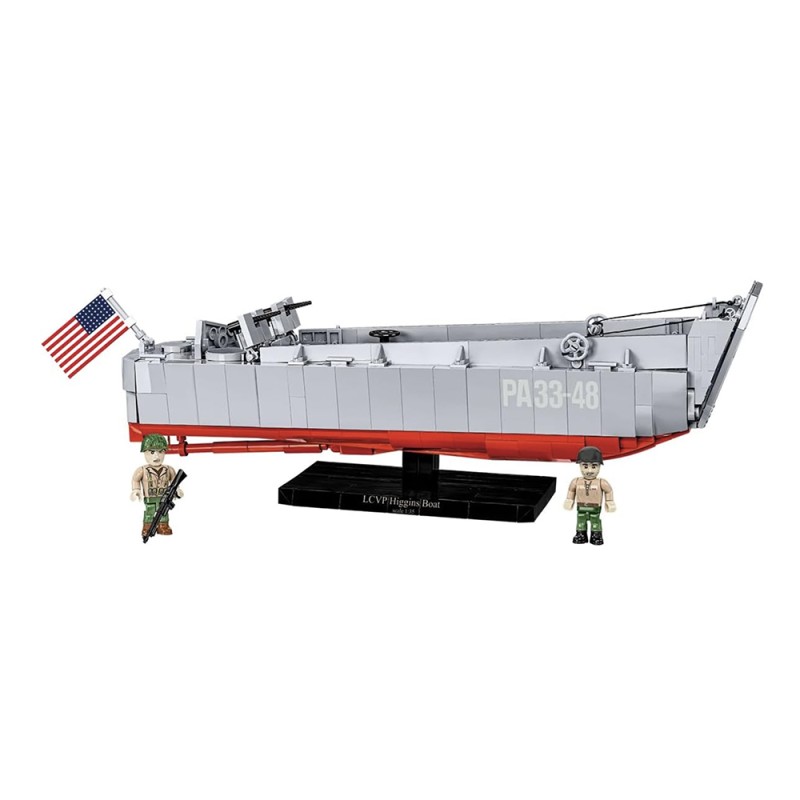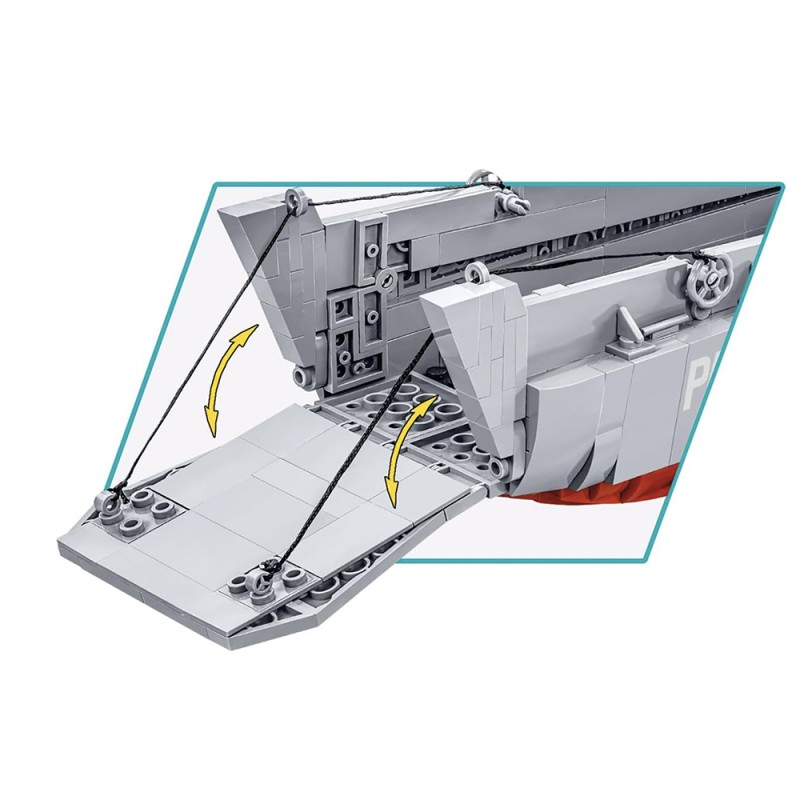 Spécialement conçu pour le 80e anniversaire du Débarquement allié en Normandie. Le kit gardera le souvenir de cet événement extrêmement important dans vos maisons qui a eu une grande influence sur le cours de la Seconde Guerre mondiale. Le modèle de bateau Higgins en briques COBI reflète fidèlement son modèle historique tout en conservant l'échelle populaire 1:35. Le bateau de débarquement en blocs de serrage a une toute nouvelle structure qui a été développée à partir de zéro. Le modèle mesure 36 cm de long. Il dispose d'une rampe à ouvrir et d'un corps complet détaillé. Le kit comprend des éléments mobiles tels que deux mitrailleuses avec couvercles et un mécanisme d'abaissement et de levage de la rampe avant basé sur un système de poulie. Nous n'avons pas oublié les détails tels que le gouvernail, les turbines et la trappe à ouvrir avec le contour du moteur en dessous. Le kit utilise des impressions permanentes. Pour présenter ce beau modèle, nous avons conçu un présentoir spécial en blocs de serrage avec une plaque avec le nom du bateau. Le kit comprend également deux figurines représentant un soldat d'infanterie américain et un marin de l'équipage des navires intérieurs. Un grand drapeau américain imprimé des deux côtés souffle sur le Kahn.