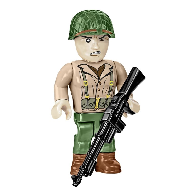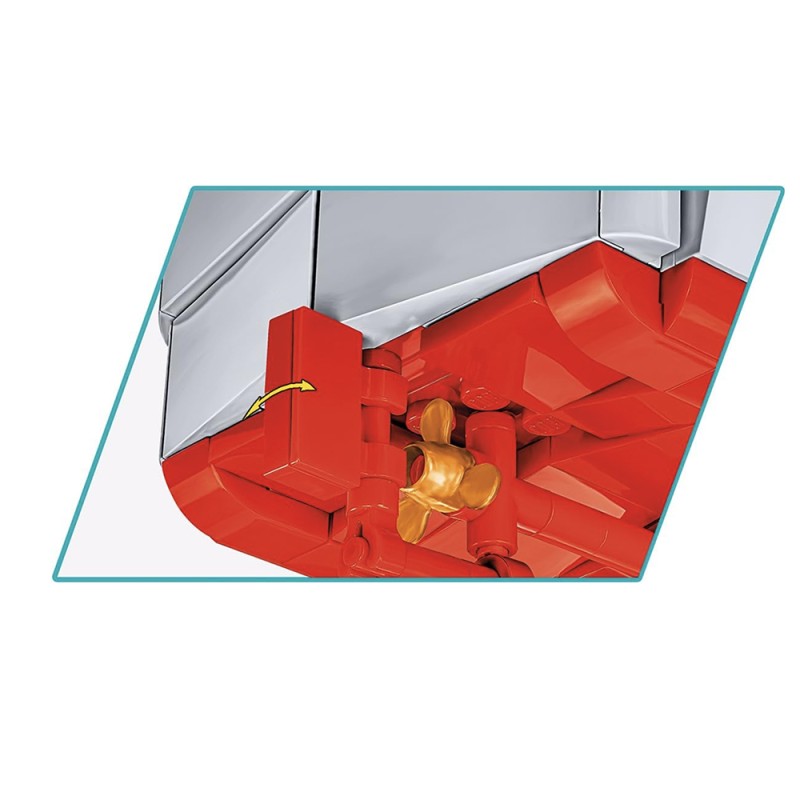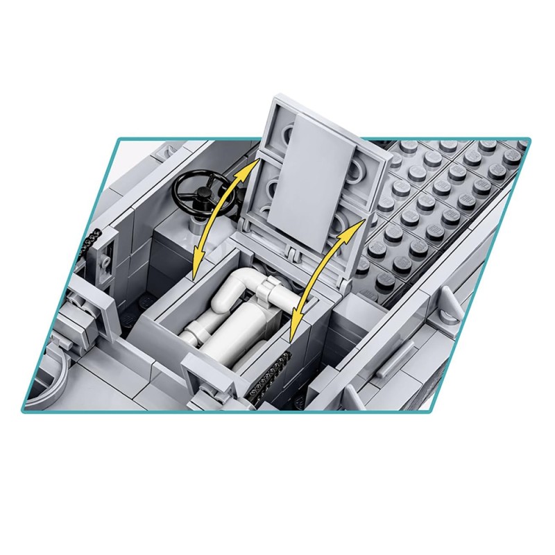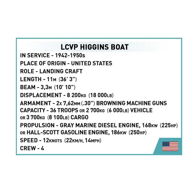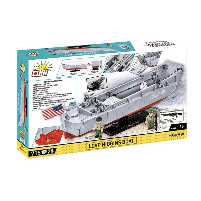Spécialement conçu pour le 80e anniversaire du Débarquement allié en Normandie. Le kit gardera le souvenir de cet événement extrêmement important dans vos maisons qui a eu une grande influence sur le cours de la Seconde Guerre mondiale. Le modèle de bateau Higgins en briques COBI reflète fidèlement son modèle historique tout en conservant l'échelle populaire 1:35. Le bateau de débarquement en blocs de serrage a une toute nouvelle structure qui a été développée à partir de zéro. Le modèle mesure 36 cm de long. Il dispose d'une rampe à ouvrir et d'un corps complet détaillé. Le kit comprend des éléments mobiles tels que deux mitrailleuses avec couvercles et un mécanisme d'abaissement et de levage de la rampe avant basé sur un système de poulie. Nous n'avons pas oublié les détails tels que le gouvernail, les turbines et la trappe à ouvrir avec le contour du moteur en dessous. Le kit utilise des impressions permanentes. Pour présenter ce beau modèle, nous avons conçu un présentoir spécial en blocs de serrage avec une plaque avec le nom du bateau. Le kit comprend également deux figurines représentant un soldat d'infanterie américain et un marin de l'équipage des navires intérieurs. Un grand drapeau américain imprimé des deux côtés souffle sur le Kahn.