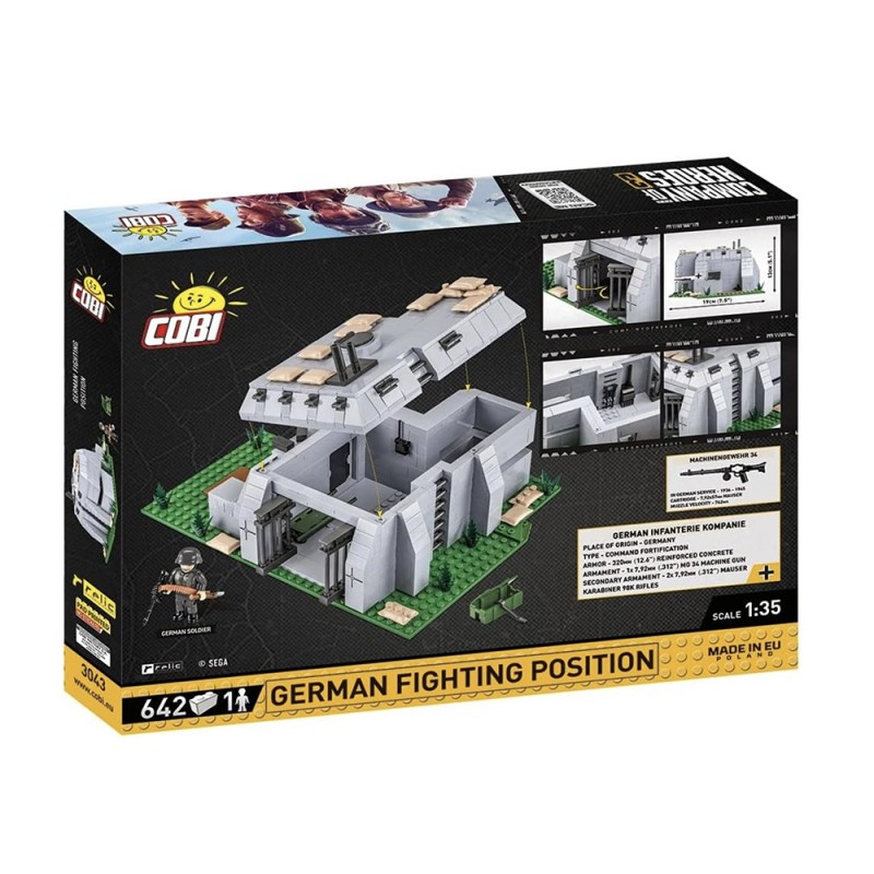 In this well-thought-out design, the roof is detachable and allows access to the detailed interior of the building. Inside there is equipment such as a stretcher, a stove with a chimney, a radio station and a gun rack. The included figure shows the details of a German MG 34 machine gun operator. The set also includes an opening hatch, a tilting entrance, ladders and handles built into the bunker, and additional accessories such as sandbags, a box, tools and extra weapons.