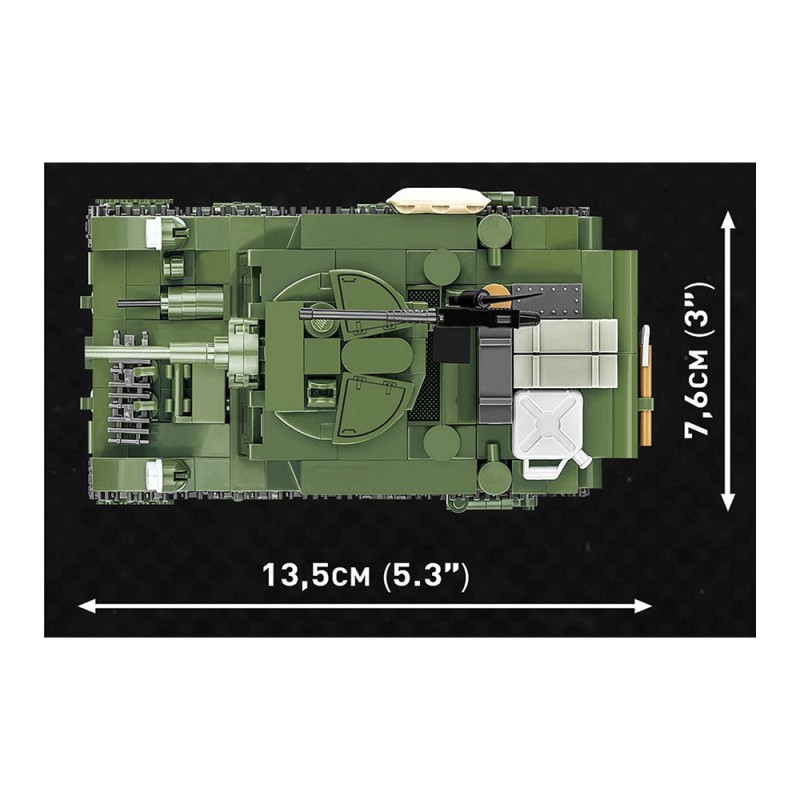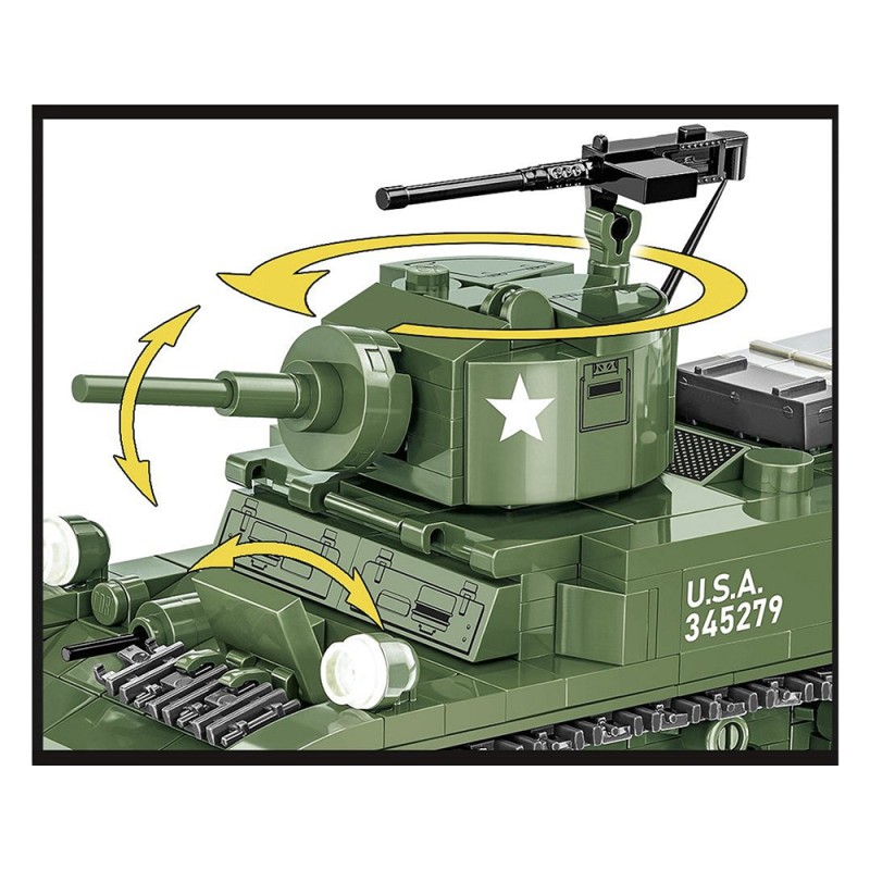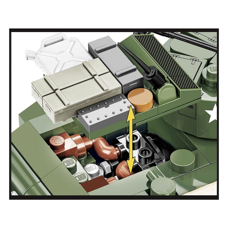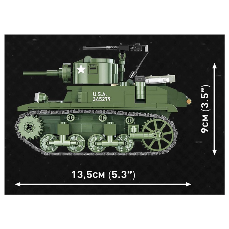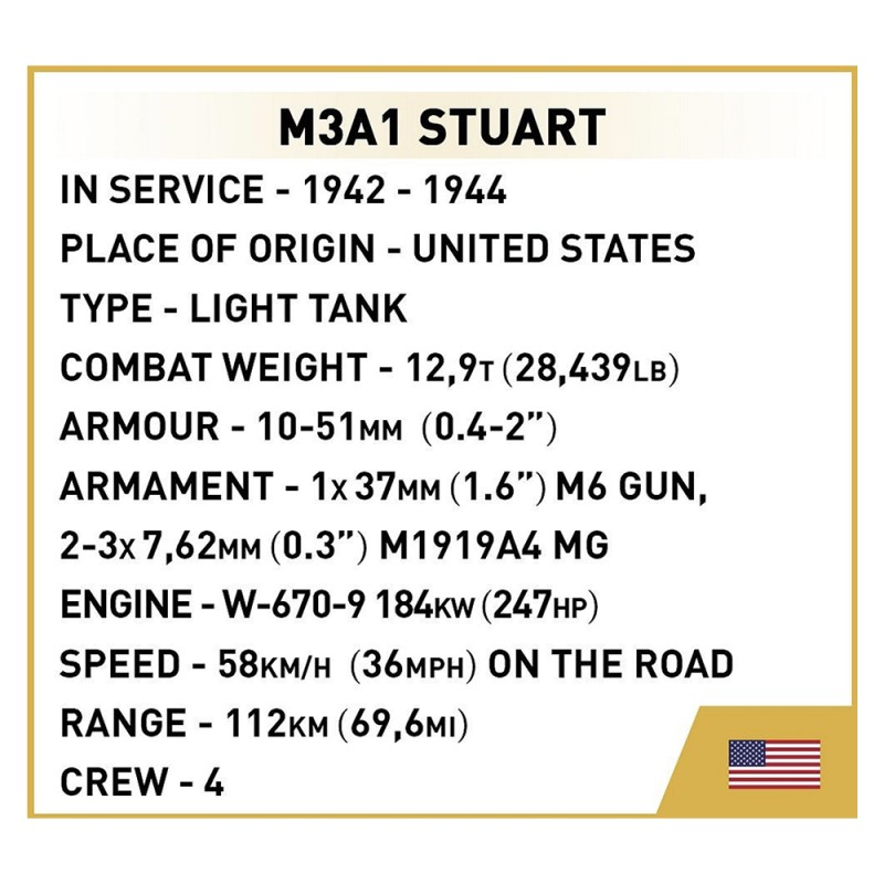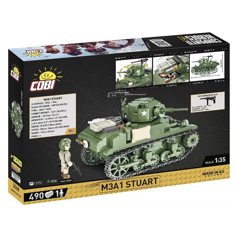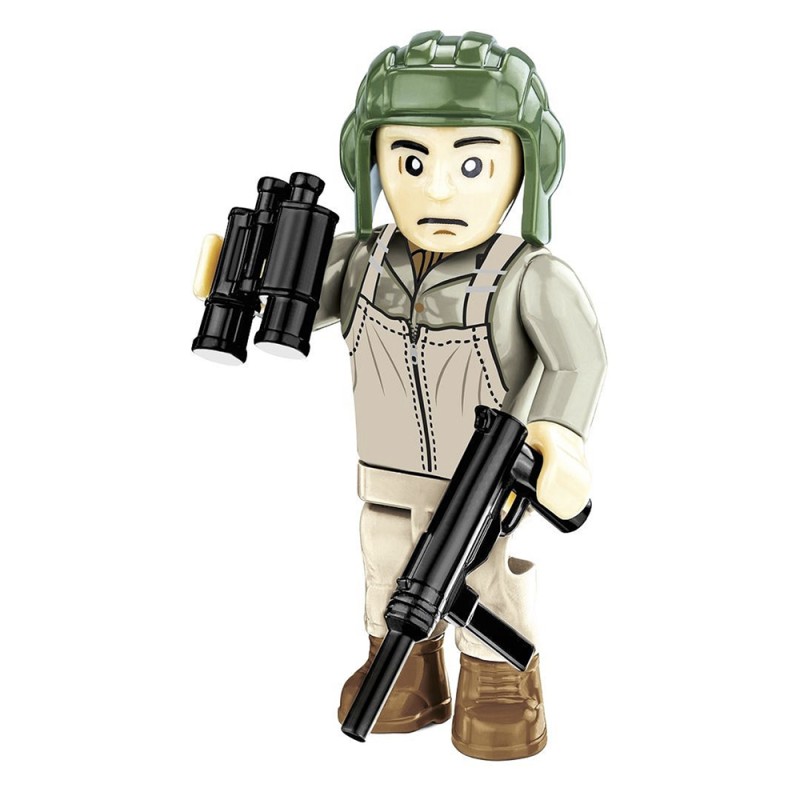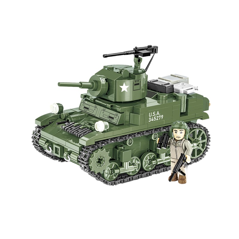 The Stuart block was carefully designed to 1:35 scale, using 488 elements. The tank features working rails, a rotating turret, a movable gun, an opening hatch and a service hatch with a brick engine underneath. The set includes an American tanker figure with helmet, M3 “Smarownica” submachine gun and binoculars.