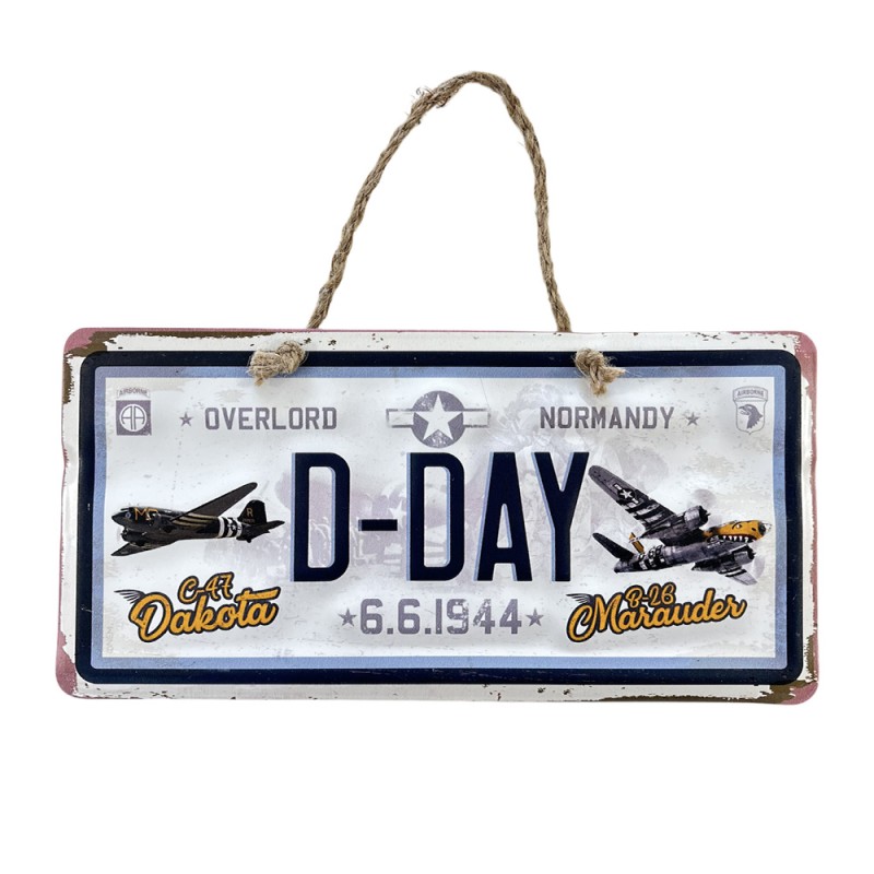 Decorative metal plaque to hang with a cord, embossed “D-Day” accompanied by two aircraft: a C-47 Dakota and a B-26 Marauder