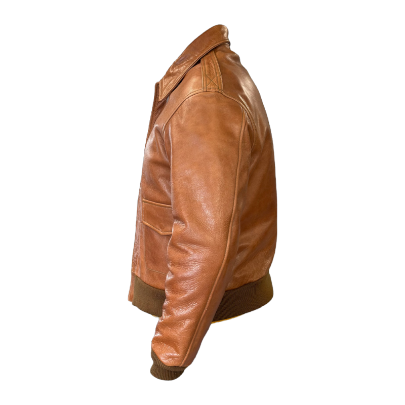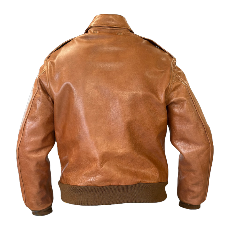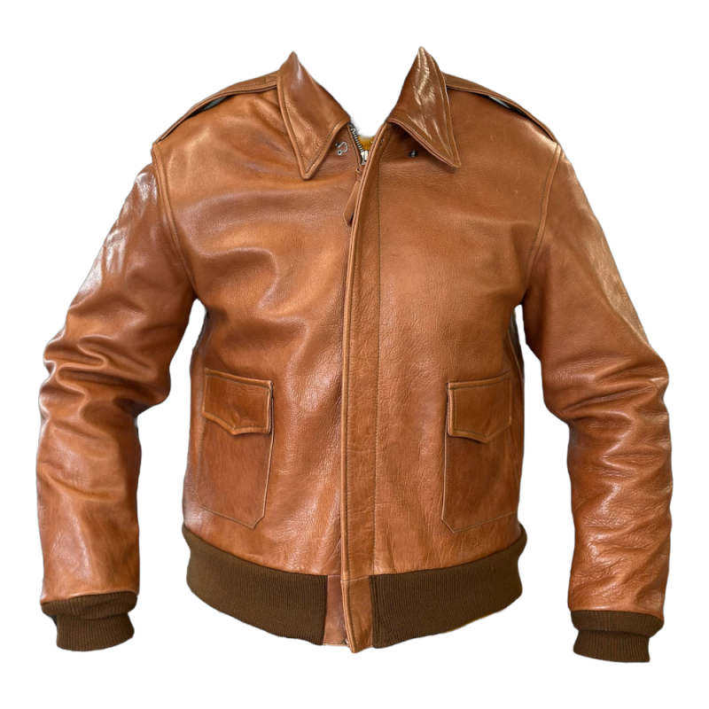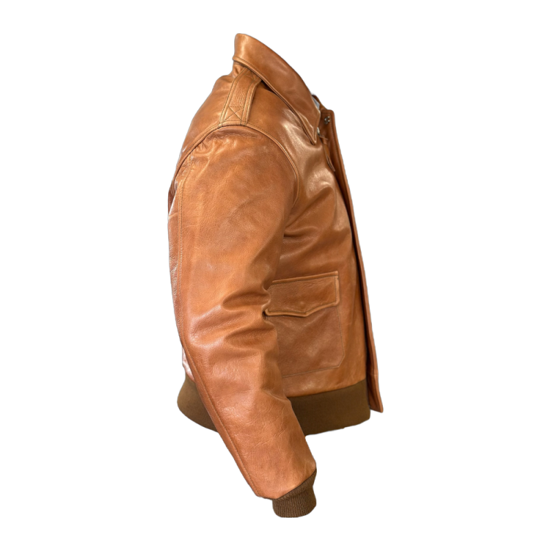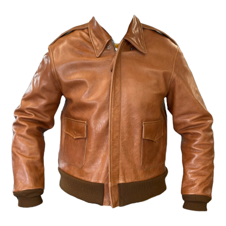 Genuine horse leather jacket in Visky Brown, this leather is semi-vegetable tanned. Tanned in Visky Brown, we use a medium brown blended knit fabric made in the USA, Repro Talon front zipper, 100% cotton lining faithful to the original color, and this A2 jacket features authentic details faithful to the original model from UNITED SHEEPLINED CLOTHING CO. DESIGN NO. 30-1415, REFERENCE 42.18777-P