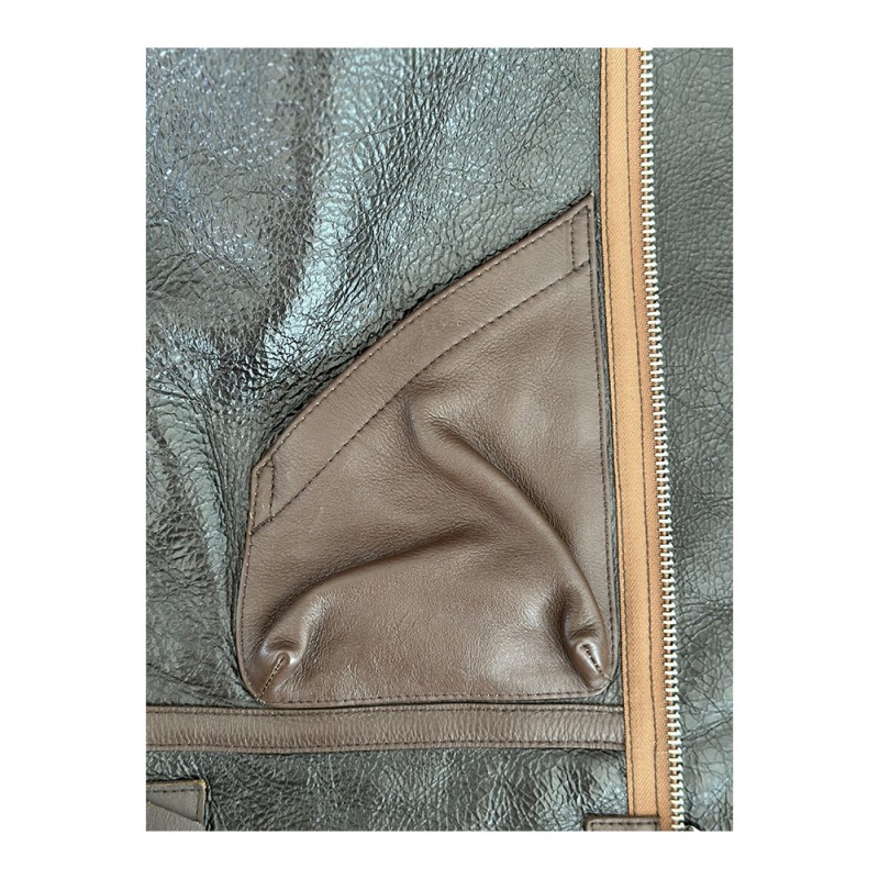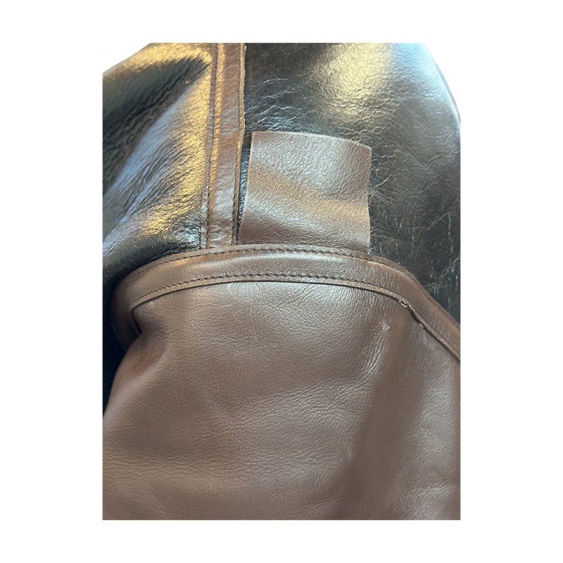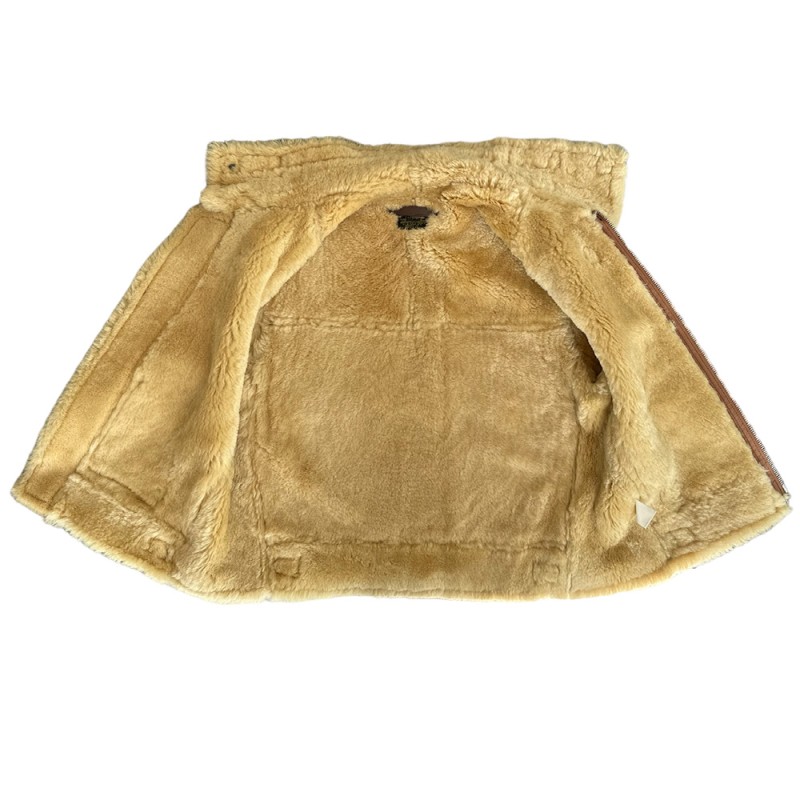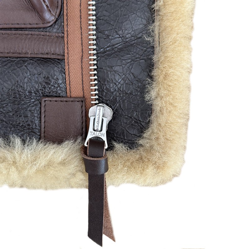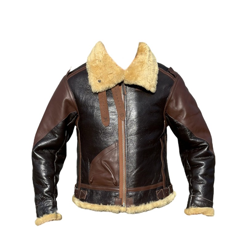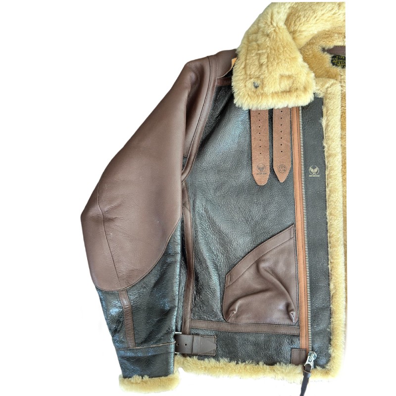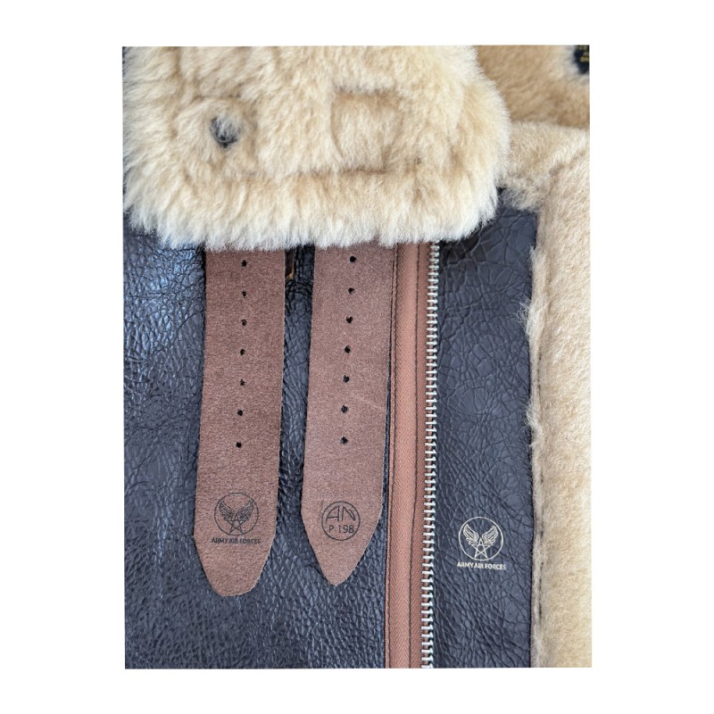 Faithful to the original, this jacket is made from sheepskin with cowhide reinforcements and straps.
