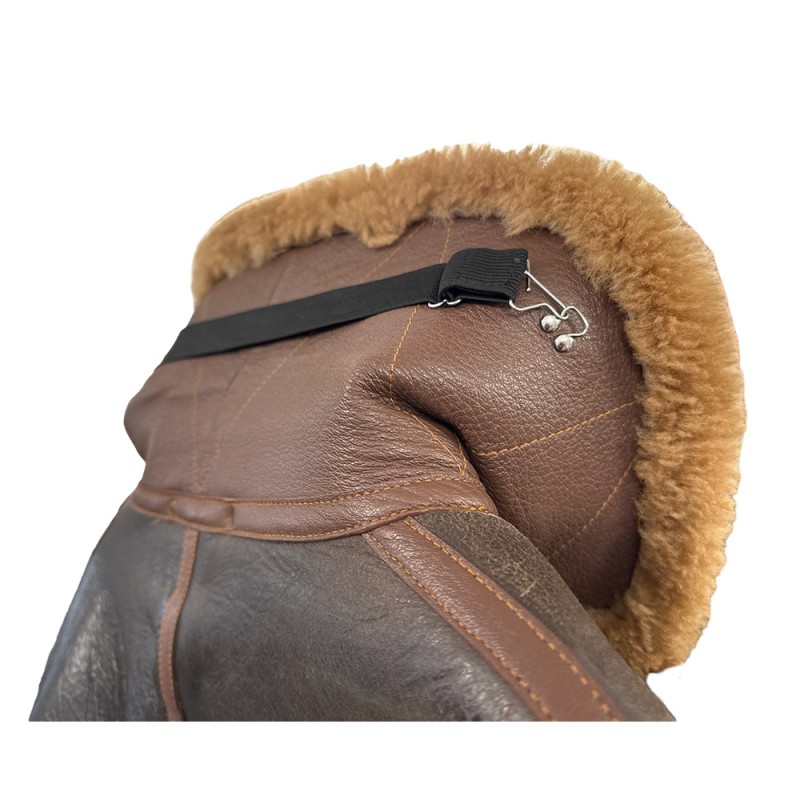 The collar strap was designed for open cockpit flying, where the strap was pulled over the head to rest on the forehead and help keep the collar up. It was later removed from jackets. To preserve originality, the FiveStar Leather RAF Flight Jacket has been fitted with replicated heavy-duty zippers, on which the pull tab has been molded from an original pull tab, to its exact size.