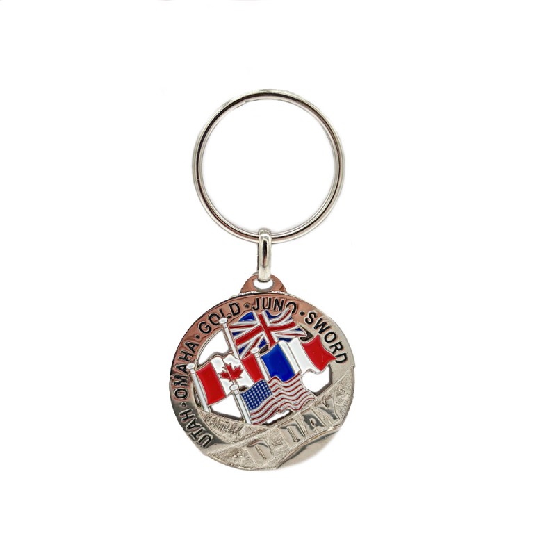 Perforated metal D-Day key ring representing Allied flags (USA, France, United Kingdom, Canada)