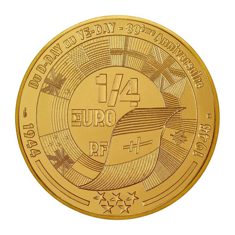 Eleven months after landing on the beaches of Normandy, Allied forces scattered across Europe celebrate the surrender of Nazi Germany. A historic day, “V-E DAY” (or Victory in Europe Day) symbolizes the end of nearly six years of conflict and the return of peace for millions of Europeans. 80 years after this decisive victory, Monnaie de Paris celebrates this historic event by paying a new tribute to the great Allied nations who fought for the liberation of France and Europe.