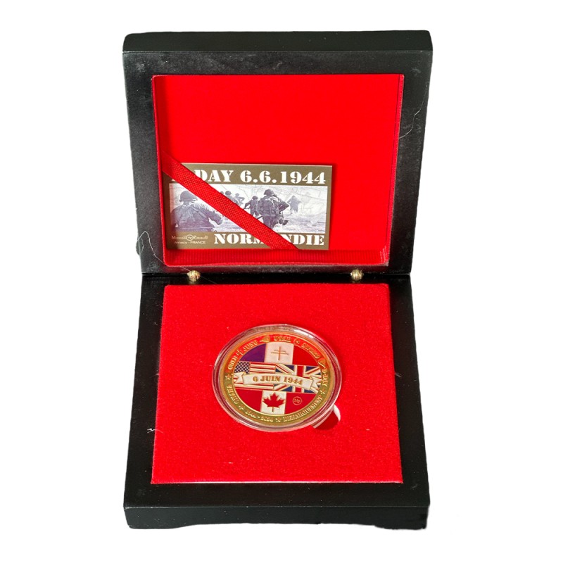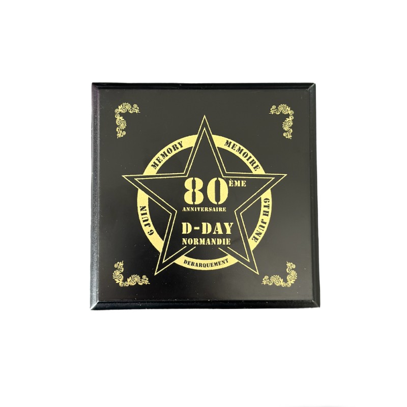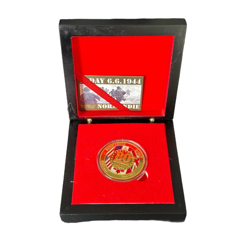 Black box containing a 40 mm medal commemorating the 80th anniversary of the Allied landings in Normandy on June 6, 1944.