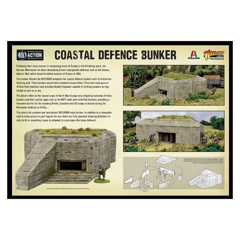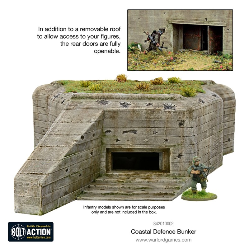 This plastic kit contains a hard plastic bunker type R612/R680. In addition to a removable roof to allow access to your miniatures, the rear doors are fully openable, allowing defenders to rush in or assault troops to attempt to breach this heavy defense!