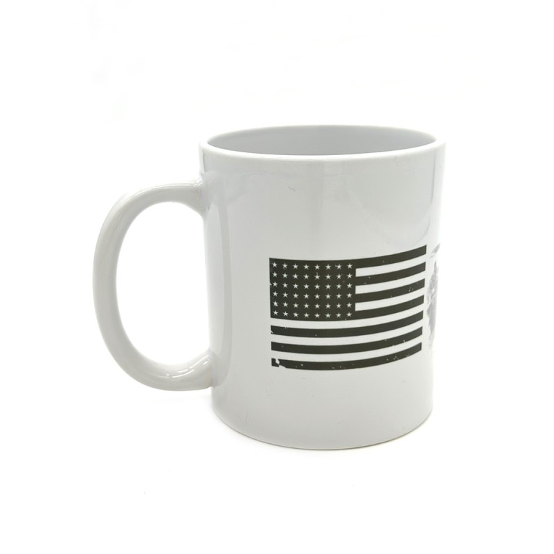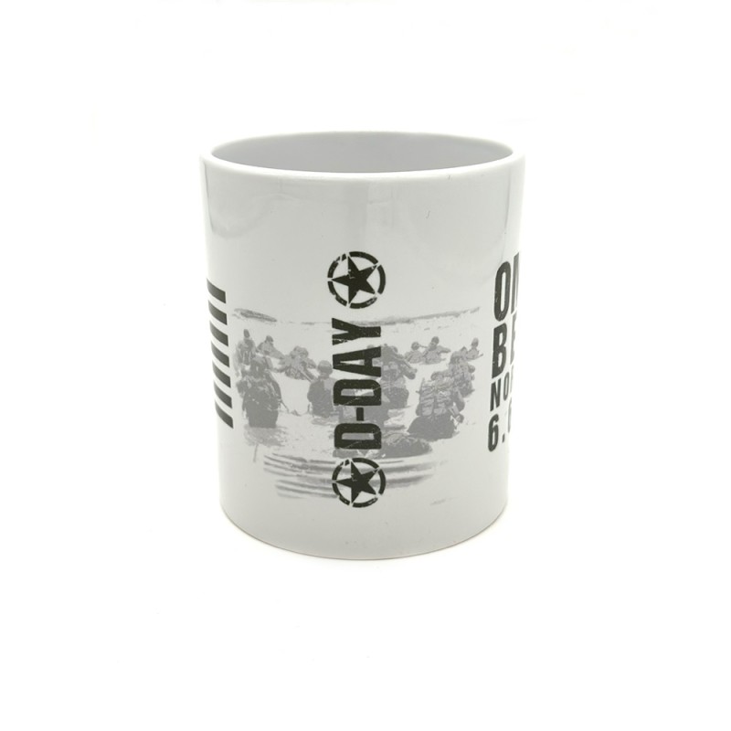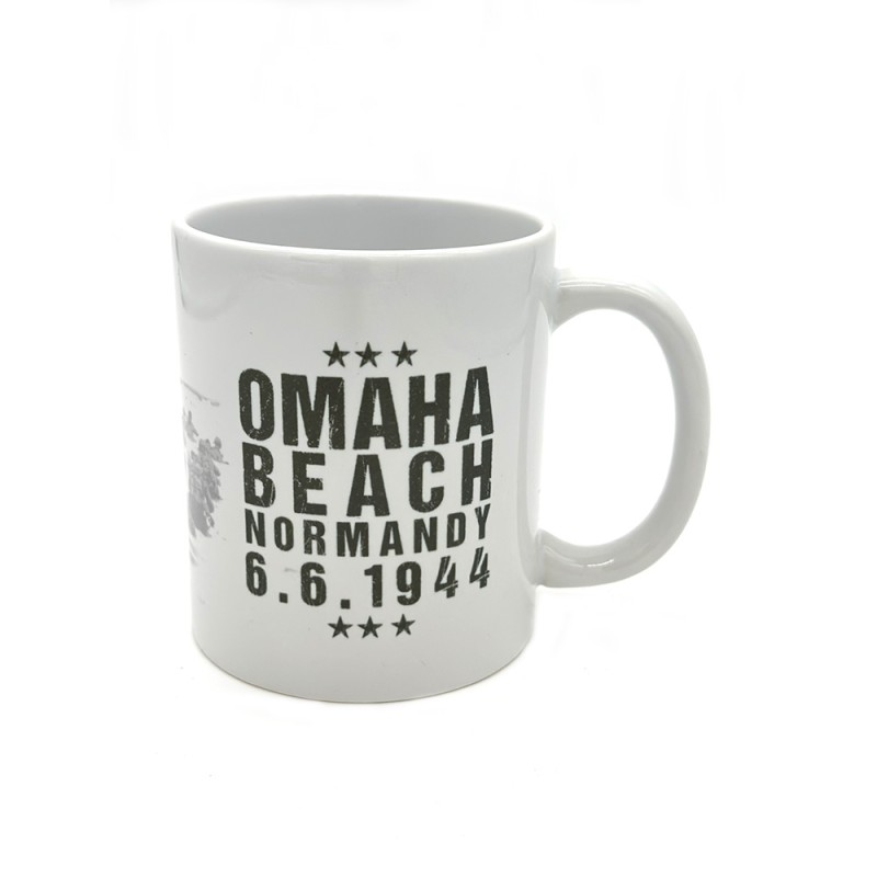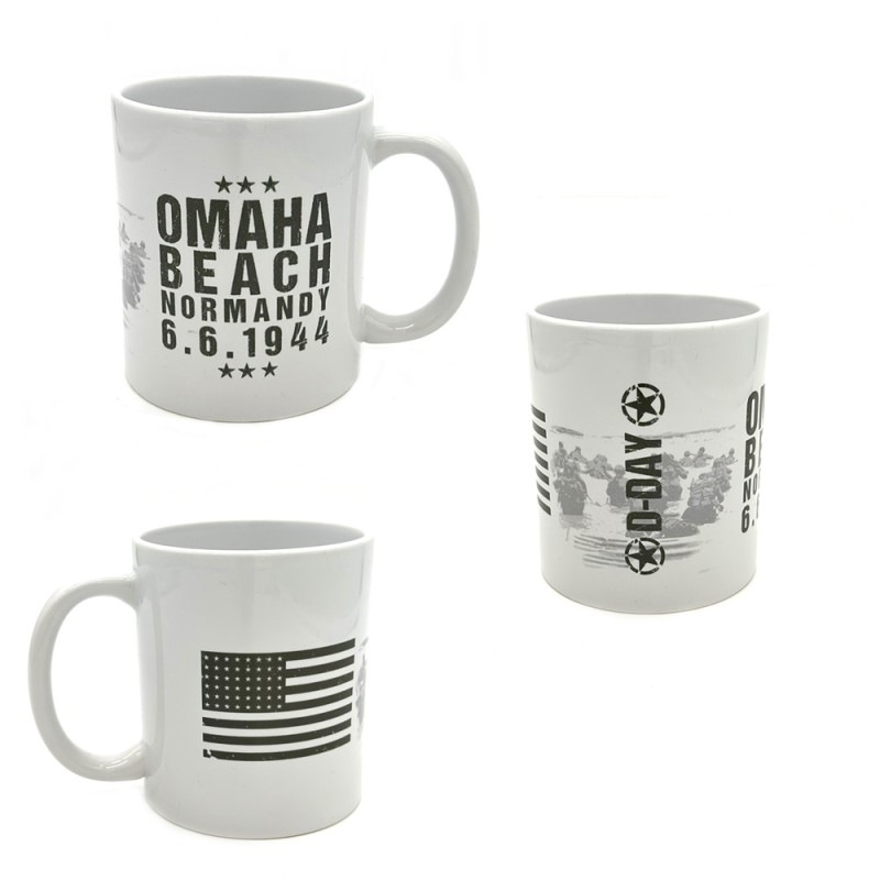 Mug with three inscriptions on three sides: Omaha Beach Normandy 6.6.1944/D-DAY/American flag