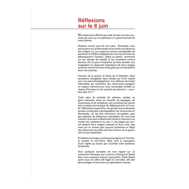 In this book are 78 veteran portraits and photographs of D-Day ceremonies taken every year since 1994. They are accompanied by the stories of 53 veterans collected by the author through the year. With each turn of page is a chance to immerse ourselves into the eyes and memories of theses anonymous heroes.