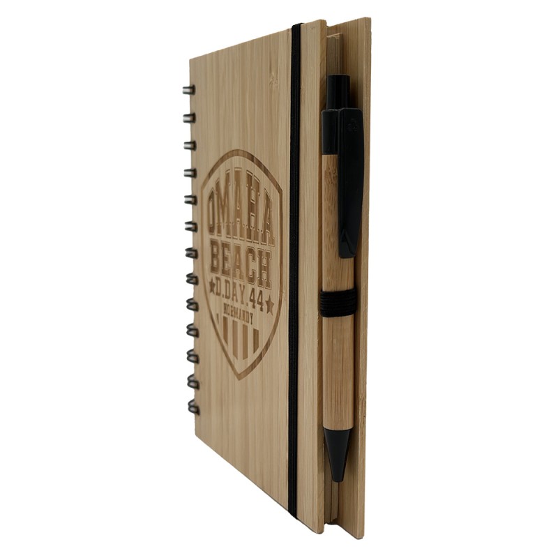 Omaha Beach" engraved A5 bamboo spiral notebook with blue pen