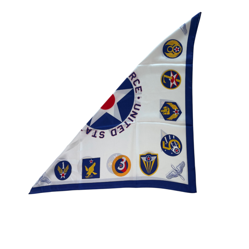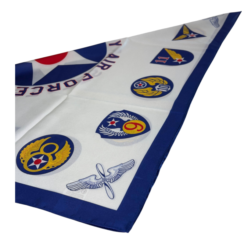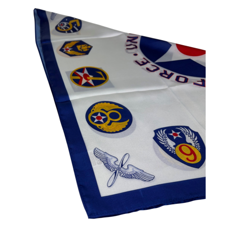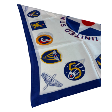 Foulard carré d'inspiration seconde guerre mondiale, avec dessus toutes les divisions de l'Us Army Air Force.