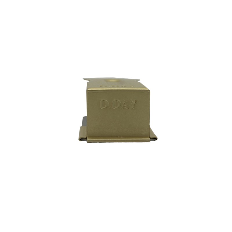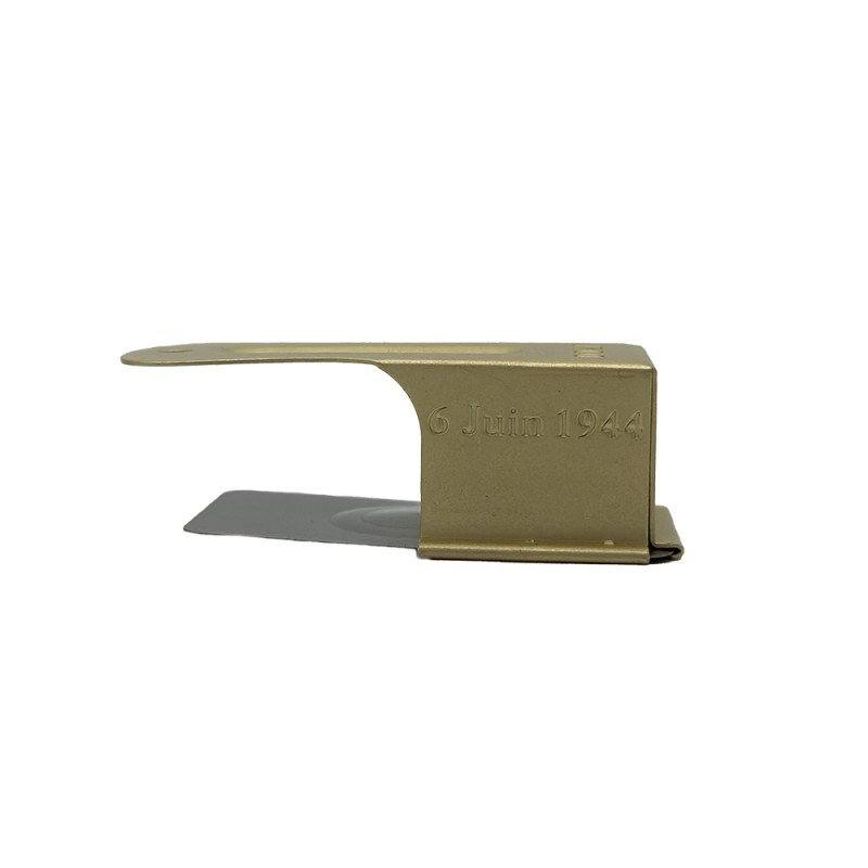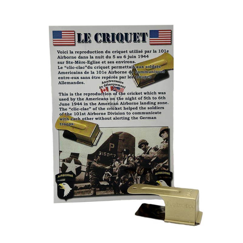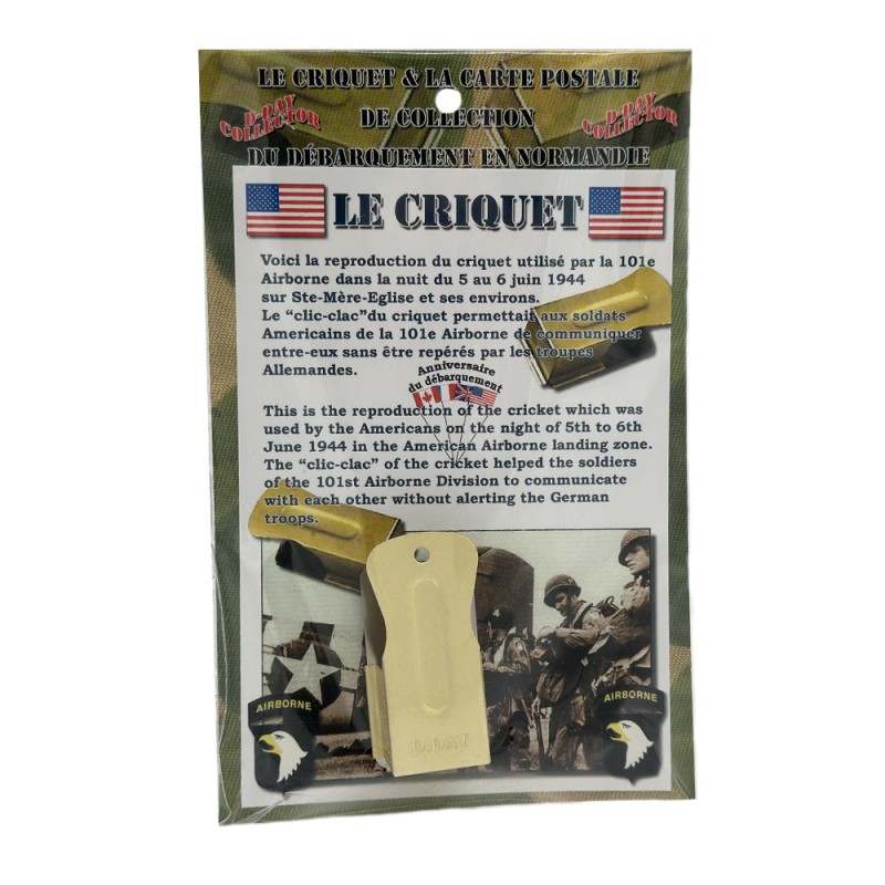 Cricket souvenir avec la mention "D-Day" accompagné d'une carte postale expliquant l'historique de l'utilisation du Cricket