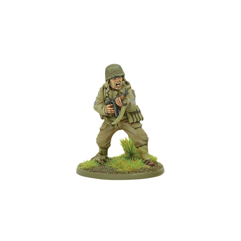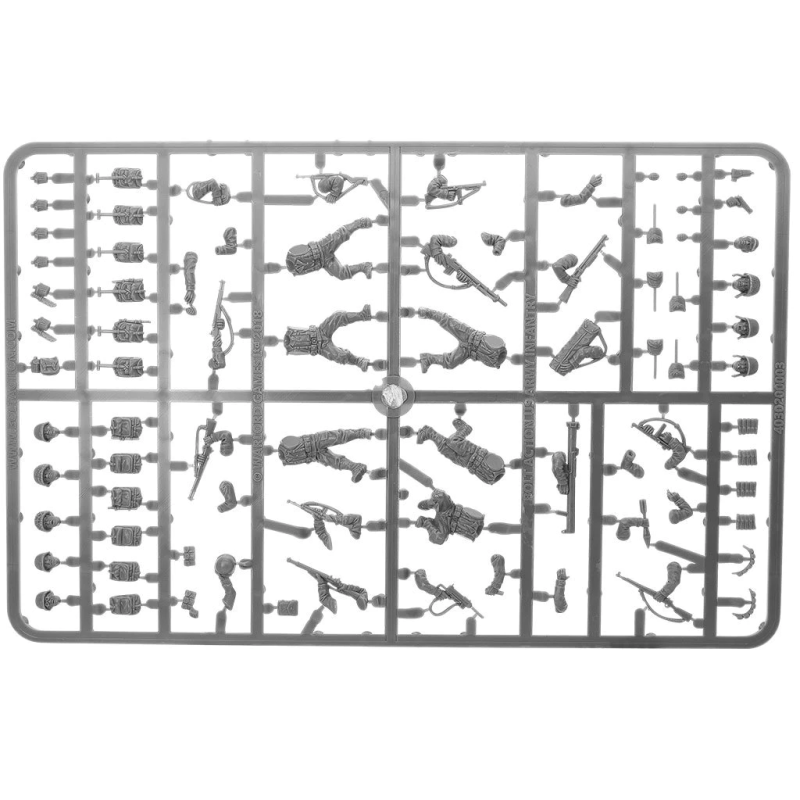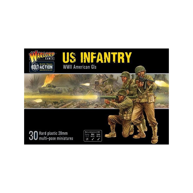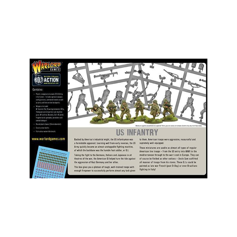Composants en plastique pour réaliser 30 fantassins de l'armée américaine (28 mm). Comprend des configurations d'armes optionnelles, des modèles de commandement ainsi que des sacs à dos de la première et de la dernière version. Comprend également, Fusil M1 Garand, fusil automatique Browning, mitraillettes Thompson et Grease Gun, carabine M1, Bazooka, pistolet Colt .45, grenades à fragmentation, bandoulières et fusil de combat !