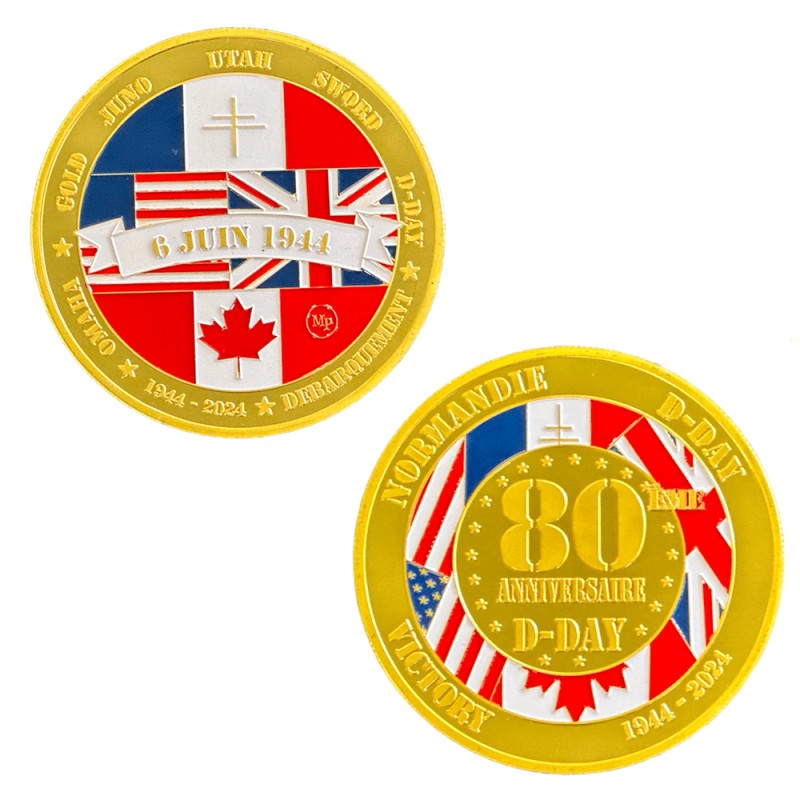 Sur la première face, l'on peut distinguer la mention "80ème Anniversaire - D-Day" entourée des drapeaux anglais, américain, canadien et de celui de la France Libre.
