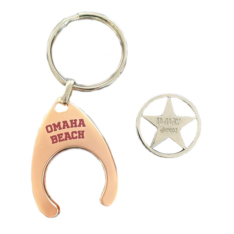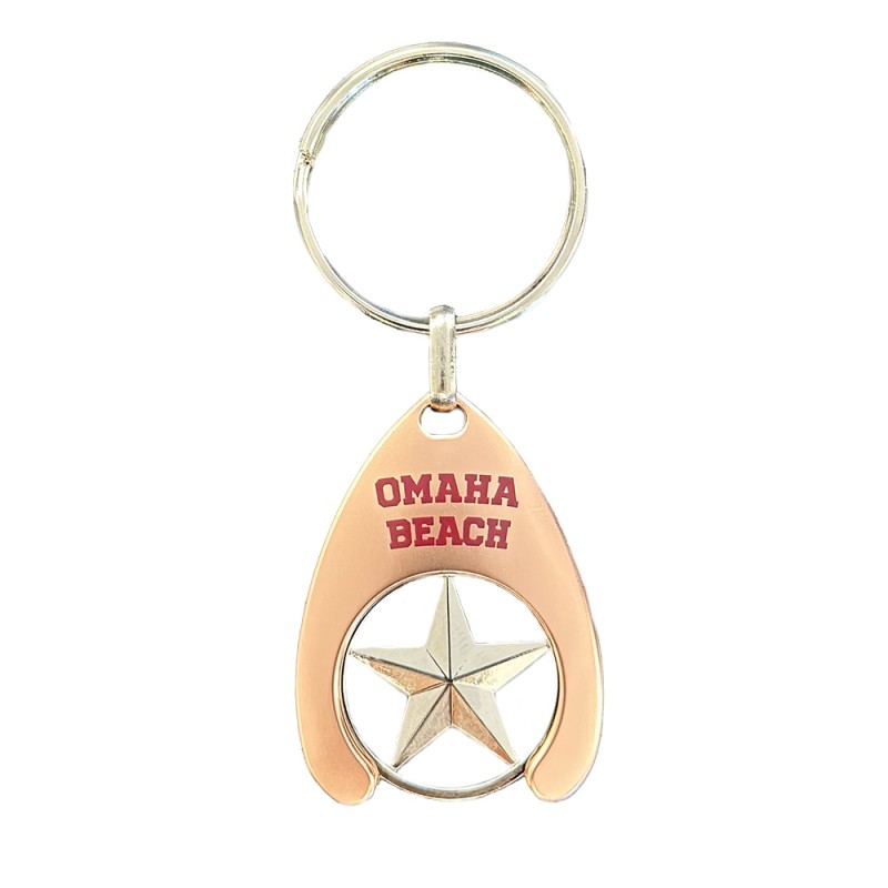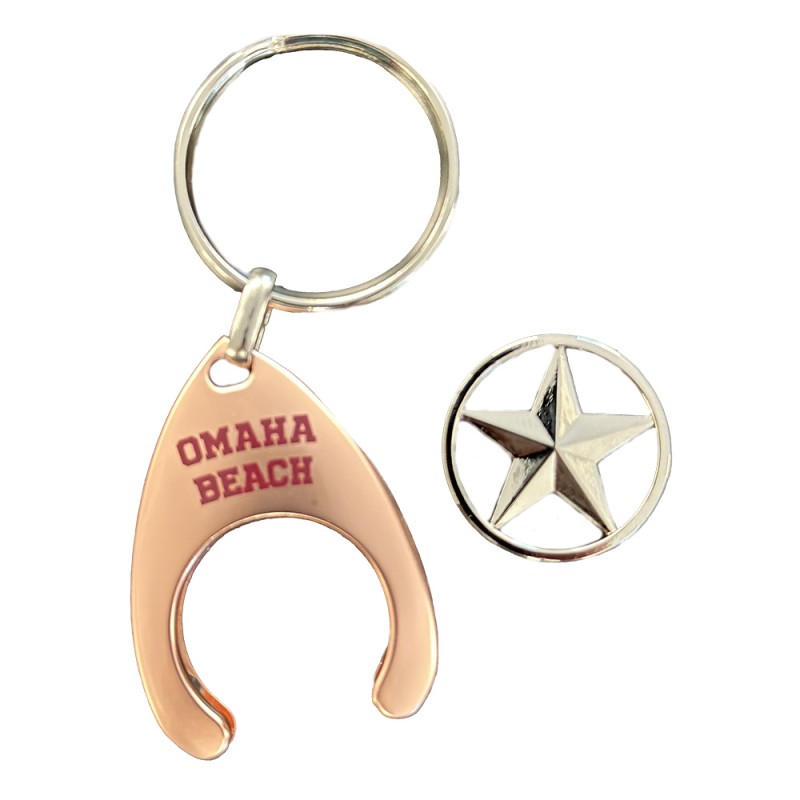 Porte-clés métal rosé avec la mention "Omaha Beach". Il est accompagné d'un jeton de caddie ajouré et amovible en forme de l'étoile alliée.